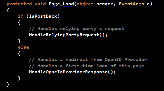 If the page is loading for the first time, this could be because the user has selected to Login, user was accessing a protected page on the Website and he/she was redirected to the Login page, or the RP has redirected back to this page (default redirect URL), the HandleOpenIdProviderResponse() method is executed. On the other hand, when the user clicks any of the OpenID images, this will cause a PostBack and hence the HandleRelyingPartyRequest() method executes.