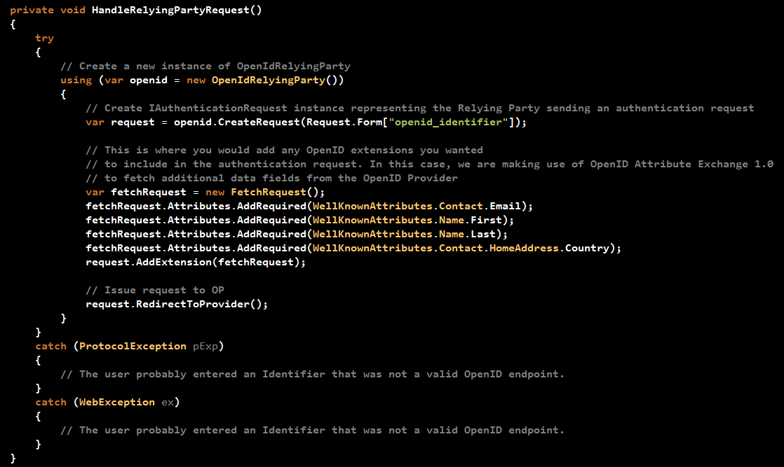 The code then attaches to the request some "demands" or "requests" asking the OP to send back some user related profile data. In this example, the RP is requesting the "Email", "First Name", "Last Name", and "Country". the AX Extension is being used in this case rather than SREG extension as it provides more accessibility to user's profile data. Google does support AX Extension, however you should always check whether a specific OP you would like to integrate into your application, allows SREG or AX or both.