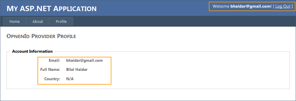 You notice at the top right section of the page, the application is now welcoming you by stating "Welcome [email protected]". Also in the body of the page, you can see that the application is relying on Google, the openid provider, in this case to retrieves the Email, Full Name, and Country.